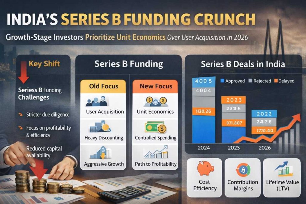 India’s startup ecosystem is entering 2026 with a markedly different funding temperament than the exuberant years that defined the early part of the decade. After a prolonged period of correction in venture capital deployment following the global funding peak of 2021, growth-stage investors are now enforcing stricter financial discipline, particularly at the Series B stage. The shift is visible across sectors: investors are placing greater weight on unit economics, contribution margins, and capital efficiency, while deprioritizing raw user acquisition and top-line expansion driven by heavy subsidy and marketing spend.