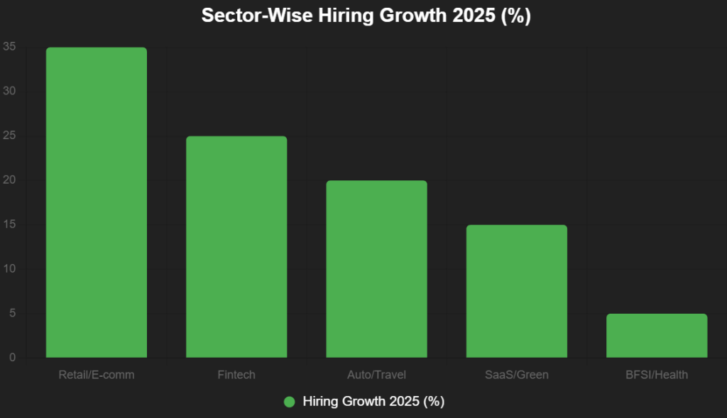 - Automotive/Travel/Hospitality (20-25% Growth): Rapido/Netradyne add 1,500 EV/safety engineers; MakeMyTrip hires 800 for hyperlocal.